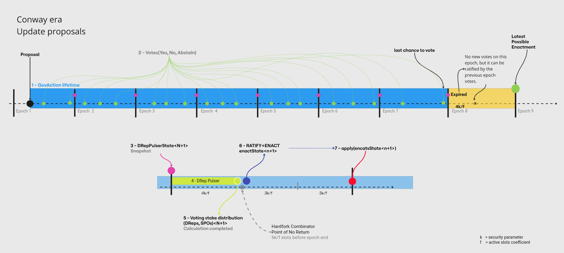 - Update proposal is registered. An update proposal starts with a transaction that proposes new values for some protocol parameters or a new protocol version. This kind of transaction can only be initiated by a genesis key via its delegate.
